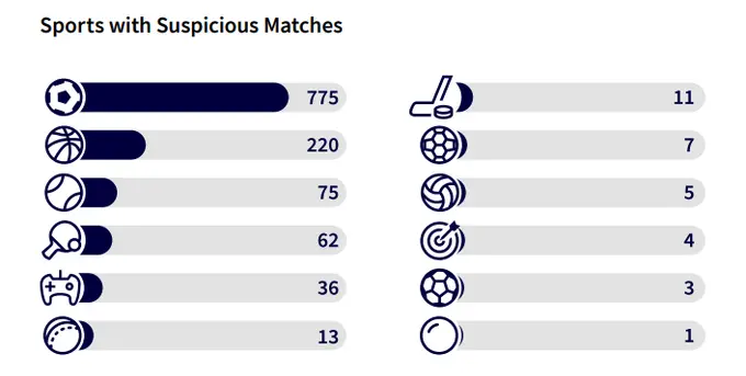 Аналитики Sportradar проанализировали 750 тысяч соревнований и матчей, обнаружив более 900 сомнительных игр. Через год количество подозрительных встреч значительно выросло до 1212 игр (прирост на 34%).